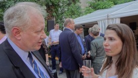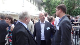 Kerti parti... Ficsor László, Martin A. Dale, a Siemens Rt. vezérigazgatója, és Dr. Gulyás Gergely, az Országgyűlés törvényhozási bizottságának elnöke 2015. június 11-én Budapesten a Német-Magyar Ipari és Kereskedelmi Kamara szokásos nyári összejövetelén