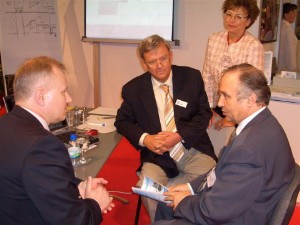 Ficsor László a MACHTECH nemzetközi vásáron Budapesten, Prof. Siegfried Keller (CNC Keller, Wuppertal), Mr. Peter Hall (Haas Automation, az USA legnagyobb CNC-gépgyártója), valamint magyar professzorok társaságában.