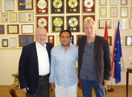 Ficsor László, Mága Zoltán hegedűművész, és Lubertus Leutscher, a holland Hineni Szimfonikus Zenekar karmestere Budapesten, Mága Zoltán irodájában.